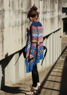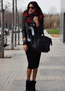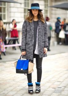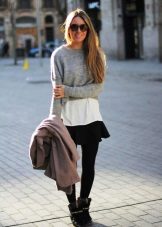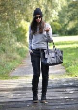 Another pretty stylish urban look, with light sloppy elements. Black leather leggings emphasize the slimness of long legs, and a gray oversized pullover, worn on an elongated cotton shirt model, is a sloppy element. A large black bag is a functional element, in this case, and a light leopard scarf harmonizes perfectly with brown leather sneakers.