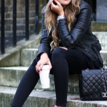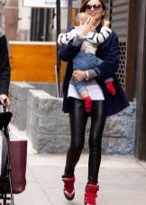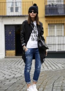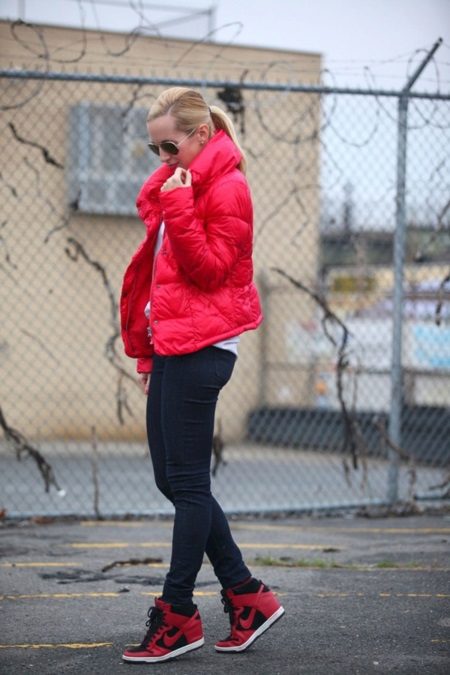 Everyday life can also be very interesting, bright and colorful, you just have to choose the right elements of the image. Navy skinny jeans can be found in almost any girl’s wardrobe, like a light sweatshirt or t-shirt. To slightly dilute the dull colors, you should choose a short red jacket of a puffy model and stylish black and red lace-up sneakers.