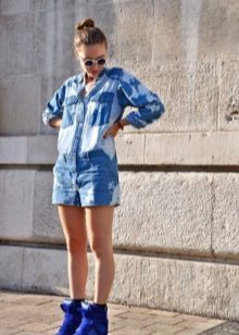 A light summer outfit suitable for walking with friends or going to the movies. Ripped denim shorts with a high waist go well with a light, slim blouse with a long sleeve. Massive suede sneakers of bright blue velcro make the look brighter and a little juicy.