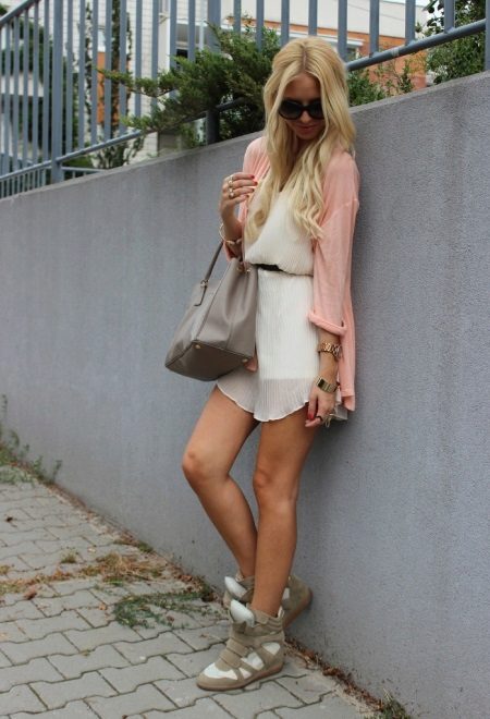 Even light feminine outfits look great with sneakers. A gentle, pleated dress of a light milk shade has a straight cut, and a narrow black strap at the waist perfectly sets off it. The perfect complement to this dress is a light pink cardigan, a large bag of cappuccino color, and an unusual creative detail - white and brown sneakers.