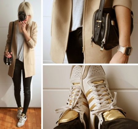 Quite an interesting outfit, close to the classic style can also contain elements of a sporty style! Black leather leggings go well with a loose light gray t-shirt and an elegant, elongated classic beige jacket. The perfect complement to this outfit is a very interesting model of sneakers in white sneakers with small golden details.