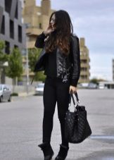 Extremely interesting may seem the image of an urban style, consisting of an elongated knitted sweater in a neutral color and skinny jeans. Supplement such a bow is with massive sneakers, which combine at least three colors: red, black and white. In winter, this image will look perfect with a classic khaki parka with fur and trim, as well as with a bulk bag, which is sure to fit everything you need. In such clothes you can easily wave somewhere out of town with friends or go for a long walk around the city.