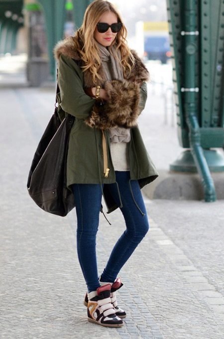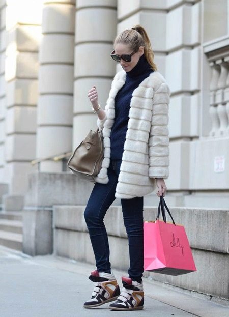 Sneakers are usually sports shoes. But this does not mean that they are combined exclusively with sportswear. A sports total bow with sneakers sometimes looks too bulky. But fur suede sneakers are perfectly combined with classic coats, sheepskin coats and clothes made of fur.