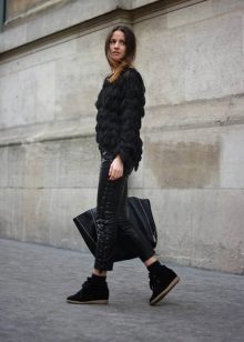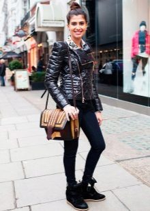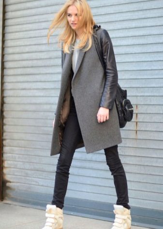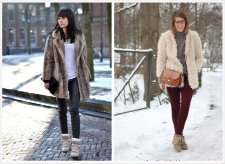 Winter models of sneakers can be worn with different outerwear - coats, sheepskin coats or down jackets, but their length should reach the middle of the hips. A short fur coat made of expensive fur in an ensemble with comfortable and feminine sneakers looks impressive and charming. Do not forget about parks or jackets.
