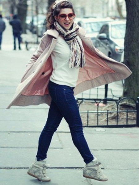 A light coat of a neat cut over a white sweater in tandem with blue jeans of a tight-fitting cut looks great in an ensemble with white sneakers.A massive scarf and sunglasses will help give the look of completeness.