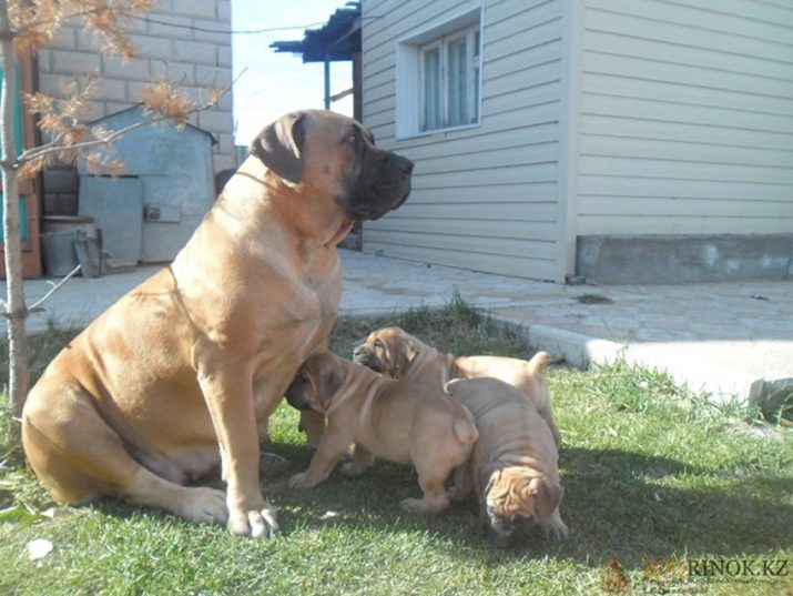During the normal course of pregnancy, you can feel the embryos for about 21 days. After a month of carrying the puppies, the female grows her stomach, and in the fifth week, the mammary glands swell and lighten. Immediately before birth, the bitch’s stomach drops, and mucus is released from the genitals. Usually the birth of babies boerboel occurs from 58 to 63 days.
