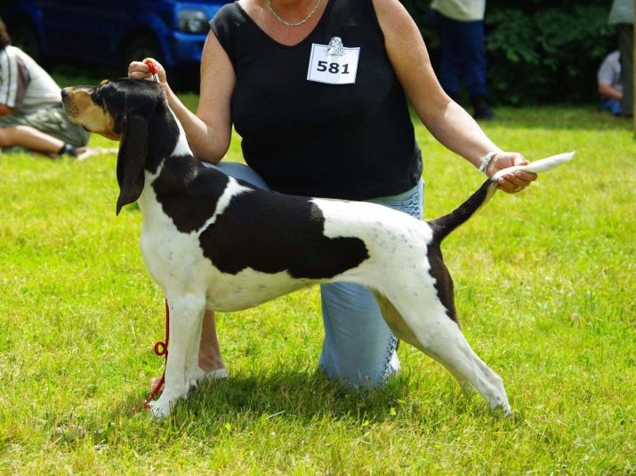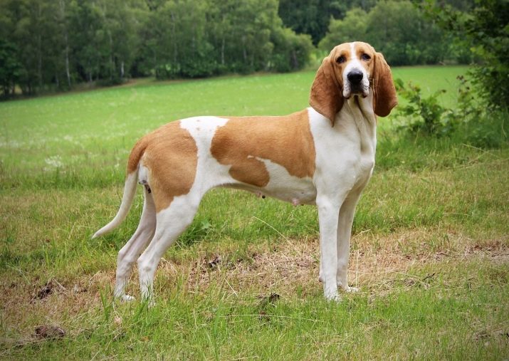 The hound has pointed long ears, a thick whip-like tail. The coat of the dog is white with red spots or splashes. At home, the dog is calm, friendly, but on the hunt - excitement and impulsiveness.