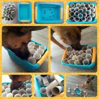 A simple and interesting option involves the use of a box or bucket of plastic. Inside, you need to put small objects, for example, rolled up socks, rubber toys, circles of paper. Between things, you can throw dry large feed pellets. The essence of the game is to find all the pieces of the treat. As a result, the room will be a mess, but the dog will be delighted.
