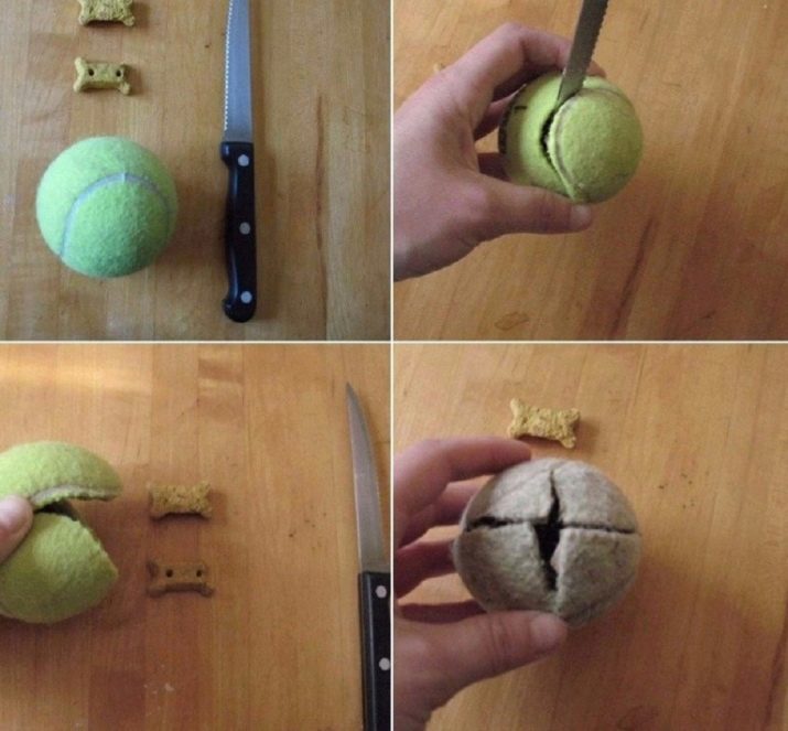 A simple toy with treats can be made from a simple tennis ball. Two longitudinal cuts should be made crosswise, and dry granules should be folded inside. The duration of the game depends on the size of the hole. In the process of kicking and tossing the ball, goodies will get enough sleep.