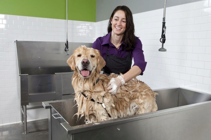 The main thing is that the room is warm, quiet, so that the dog is accustomed to being in a bathing place.