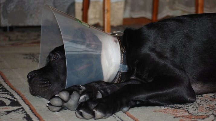 - Suture processing. After the operation is completed, the puppy will need to wear a special collar that will prevent the pet from touching the ears in any way, for example, scratching them. It is permissible to remove the stitches for about 10 days, and even after a week it will be possible to refuse to wear the collar. Seams should be treated with hydrogen peroxide or other similar preparations. This will need to be done daily. When the sutures are removed, the inside of the ears should be glued with a band-aid so that the position is fixed correctly.