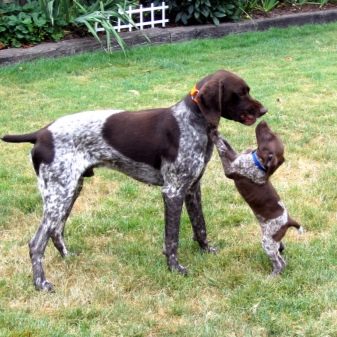Other pets for the Kurzhaar are also not a problem, unless it is a poorly socialized individual. Dogs of the breed in question do not seek to show their superiority and will not try to take the main place in the house.The only exception is the living together of two males, who will growl at each other in an attempt to prove the right to the existing territory.