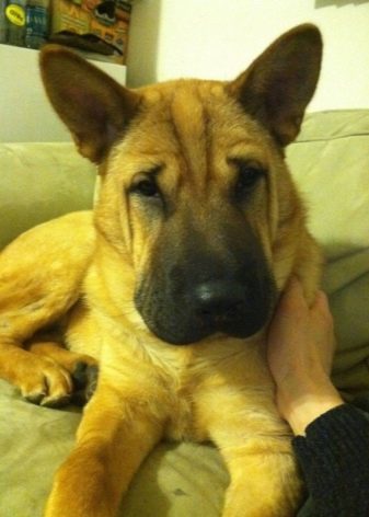 - German shar pei. Outwardly, it looks like a shar pei, only large and with the color of a German shepherd. On the elongated face there may be folds, ears are erect. I took the best from my parents - mind, devotion, love for my family. A pet can be too independent and not too trusting of strangers.