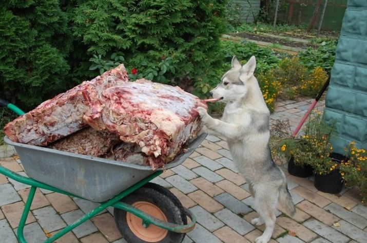 For puppies aged 6 to 12 months, during their rapid growth, meat is given based on their weight and breed. Miniature dogs, whose weight in adulthood will be no more than 10 kg, give from 0.75 to 1 kg of meat per day. Medium-sized breeds that, when grown, reach a weight of 10 to 25 kg per day, can give from 1 to 2 kg of meat. Large dogs, whose weight at a mature age reaches more than 25 kg, give from 2 to 2.5 kg of meat.