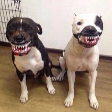 - “Evil” closed muzzle with grinning huge teeth stained with blood (often such scary models are bought for fighting breed pets so that outsiders have even less desire to approach them with an obsessive desire to touch);