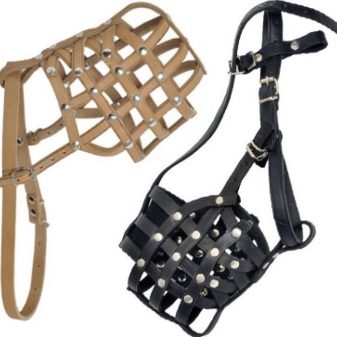 These models are a mesh design consisting of sturdy leather straps. In this product, the animal can open its mouth, stick out its tongue, breathe easily and unhindered, drink water. Mesh muzzles are suitable even for cases when a pet needs to be encouraged by a treat. These muzzles are designed for daily walking, transportation and training of animals. Unfortunately, many models of this type in no way prevent a dog from picking up different debris and food debris from the ground. To prevent the pet from “vacuuming” on the street, you will need to choose options with a blank or bottom and a large gap between the side straps. These models can be selected for representatives of any breed.