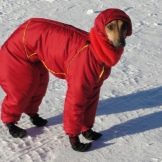- the first "autumn" clothes - a knitted blanket sweater that covers the neck, chest and back of the pet, it can also be worn at home or under a winter jumpsuit;