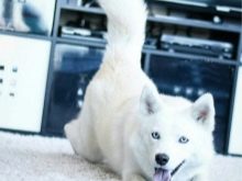 - White Pomsky. This species is very rare, it is distinguished by larger sizes, plain wool of pure white color and sophisticated outlines of the muzzle.