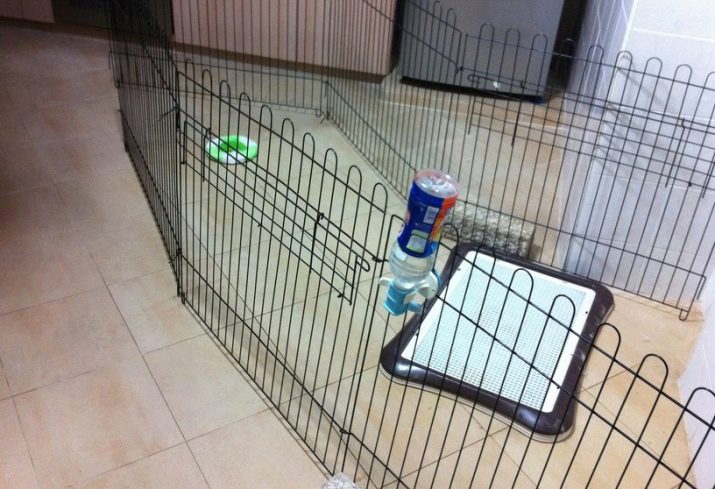 You can create an improvised aviary on your own. Masters can use chipboard, and those who can’t boast of joinery skills can put metal fences around the perimeter of the room instead of an aviary. Inside such a pen are placed a couch, toilet, bowl, drinking bowl and toys. The enclosed space method is used by many dog breeders; it greatly facilitates the process of teaching a dog to a home toilet.