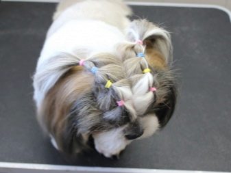Cute Asian-style looks are widely popular among Shih Tzu breeders. Korean haircut allows you to give the dog the appearance of an anime character. To do this, the maximum length of the hair is preserved on the head and ears, pigtails or tails are formed here on both sides of the head. The beard and mustache are cut short, forming a rounded silhouette of the muzzle.