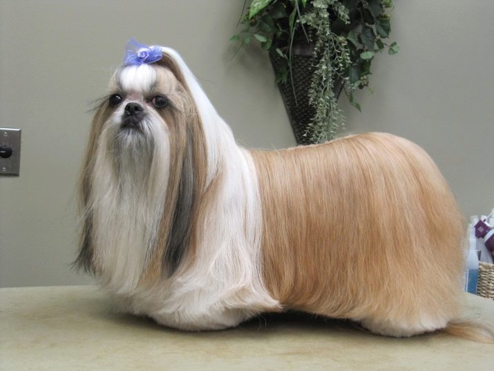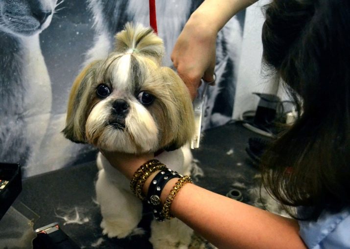 Show-class dogs need competent emphasis on their pedigree features. The canonical hairstyle of Shih Tzu dogs implies the formation of the right parting from the top of the dog to the tail of the dog. The hair flows all the way to the tips of the paws, looks flowing and silky. The cover is shortened only in the area around the eyes, and a beard with a mustache is carefully formed.