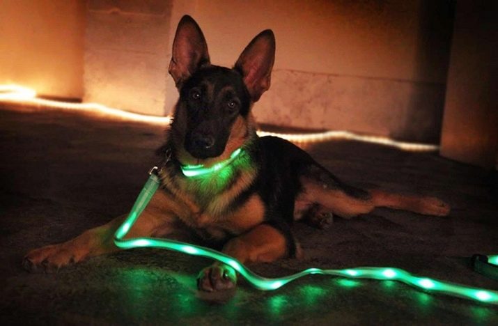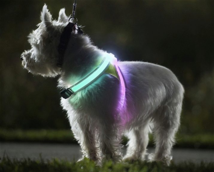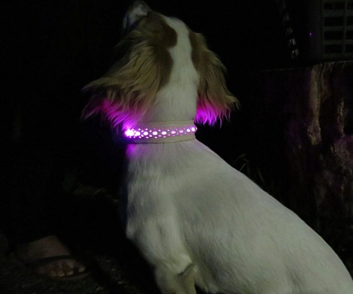Too bright or flashing light is harmful for dogs: reduced clarity of vision. The dog can be disoriented for the first walk, so it is more advisable to use a collar with a nylon tape, which partially drowns out the glow of the diodes. For the same reasons, it is not recommended to use the flashing or flickering mode of operation of the luminous accessory.