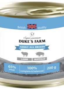 - In second place is food for dogs of different ages. Duke's Farm, which includes natural ingredients. In addition to meat, in the broth there are spinach, salmon oil, apples, cranberries - sources of minerals, vitamins and fatty acids. No cereals.