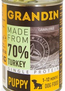 - Super Premium Premium Wet Food Leader - Brand Grandin. There are no extra ingredients in its products. The meat contains more than 65-70%. It is flooded with flax oil and minerals. Manufacturers comply with internationally recognized standards. 4 flavors are produced: chicken, turkey, lamb and beef.