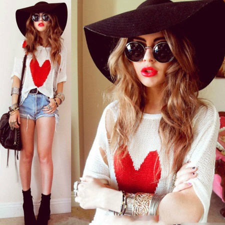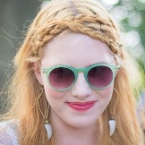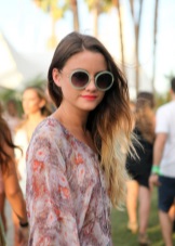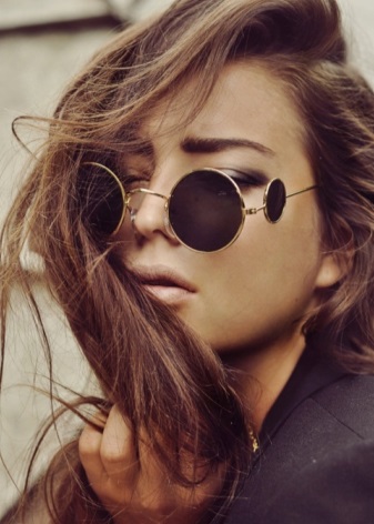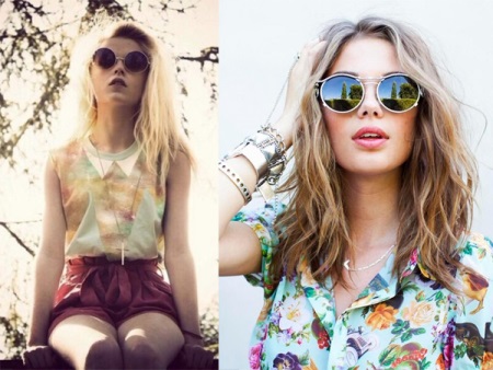 Round glasses will not be appropriate, except in sports style. Otherwise, among the variety of models and colors, it is very easy to find sunglasses that are suitable for any style and occasion. For example, round glasses with bright mirror lenses perfectly complement the image in the hippie style. In this style, it will be appropriate either to frame the contours of the face with careless styling, or to braid French braids and complement the image with large earrings.