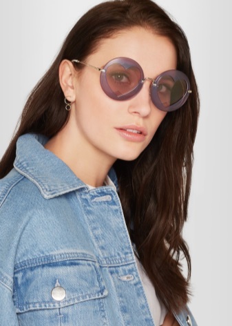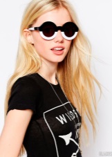 Round glasses in a massive decorated frame should not be combined with colorful fabrics and bright makeup. They are self-sufficient, so they will be an excellent accessory for plain clothes of simple, free and concise silhouettes. In a retro-style look, it is better to use classic tishades - a combination with a noodle dress will emphasize the advantages of an excellent figure, and a voluminous jacket made of aged jeans will add to this set of charm.