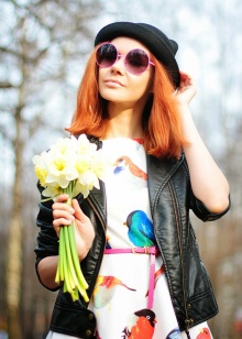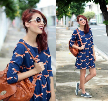 In combination with round sunglasses in a large milky frame, it is better to choose clothes of dark, muted colors. The most beneficial such sunglasses will look on girls with dark hair. A dark blue dress and a brown backpack will make an ideal tandem for light-framed tishades that will become a bright, fresh accent in this image. A free cut dress is enlivened by a funny and cute print, and in combination with a backpack it will be appropriate to complement the set with flat shoes.