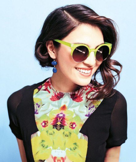 A bright curly-shaped frame in the shape of a “cat's eye” is a stylish and very bold accessory that not everyone will decide on. The bright green color of the frame goes well with a colorful dress, in the coloring of which there are elements of this color. Black inserts make the image balanced and do not allow the dress to turn from bright to vulgar-motley. Bright blue earrings in the shape of bright beads are the best choice for a tandem with tishades in a curly frame. Cat-shaped glasses should not be combined with contrasting accessories in geometric shapes.