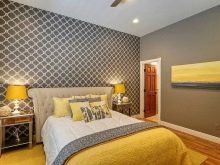 If a bright ornament or, for example, large flowers is something that seems stylish and suits your idea of a cozy bedroom, you can decorate the wall above the head of the bed with such wallpaper. This will not distract from falling asleep, and will not turn the room into a dazzling field. One accent wall is enough.