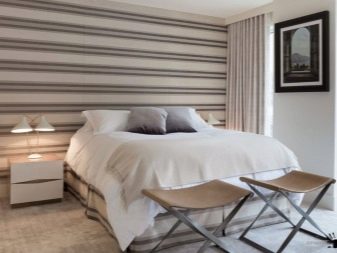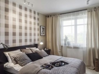 - Cell, strip. Striped options that are color-tinted are often a conciliatory solution if disputes about wallpaper in the bedroom are at an impasse. It is difficult to get tired of the strip, it is laconic and moderately strict, it does not carry any fashionable tasks (which tend to become obsolete, succumbing to new trends).With a cell, everything is the same, except that for some reason men prefer a cell more often. Women probably consider her very strict.
