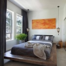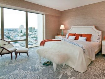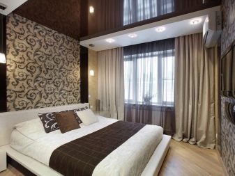 It is very important that the texture of the material fits into the overall style picture and harmonizes with furniture, accessories, lighting. You can decorate the walls with paintings or choose wallpapers with floral themes, photographs imitating velvet, tile, leather. The fabric on the walls will fit perfectly into the oriental design. In modern areas, moldings are widely used for dividing zones, highlighting certain areas on the walls. A bedroom of this size allows you to safely zon it, here moldings will come in handy. In addition, this type of decoration, depending on the placement, can “raise” the ceiling, narrow or expand the wall, and increase the window opening visually.