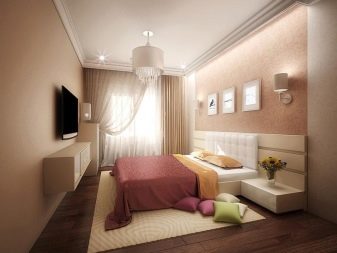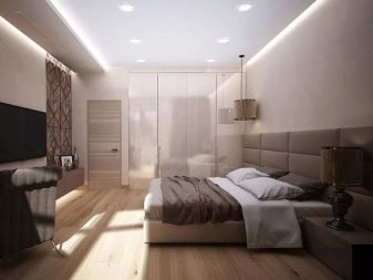 First of all, the bedroom is a resting place, so all the details of the design decision should be directed in favor of this destination. Give up bulky chandeliers, despite the fact that the size of the room allows you to do this. Not the best options are chandeliers close to the ceiling, bright, clearly directed light. Lighting should be soft, not annoying. The perfect solution for the bedroom 19-20 square meters. m .: