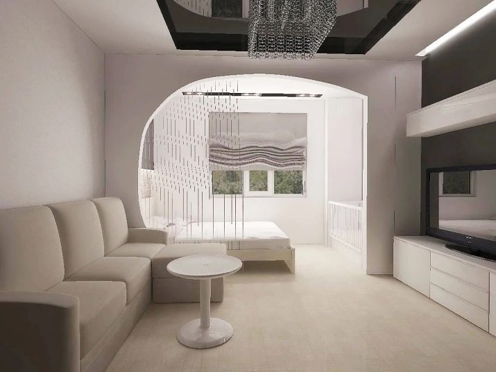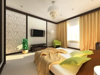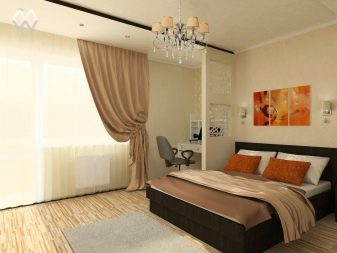 The area is 19–20 square meters. m. It is quite possible to combine the sleeping area with any other. In this case, it is better to place the sleeping area away from the exit so that it is not on the first line of sight at the entrance. If the room has access to a balcony or a loggia, you can consider the option of combining them with a bedroom. Such a space allows you to connect several functional areas: