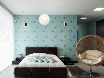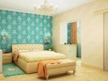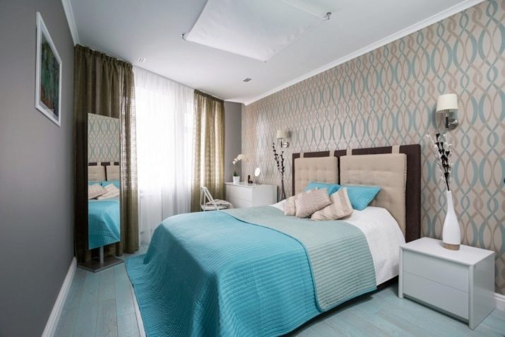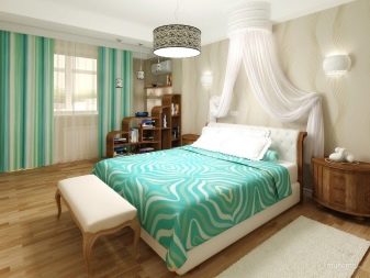 - Bedroom in light blue and turquoise shades fill the room with sea romance and will be a great place for a relaxing holiday. Such an interior is suitable for many styles and will look great regardless of footage. When color combinations should be borne in mind that blue is a cold color, and there is a risk of making the interior impersonal, therefore, it is best to choose a warm tone as a combination. For example, peach, orange, yellow and beige shades are suitable. Such an interior can look very interesting - in particular, do not be afraid to combine darker and lighter shades of blue with each other.