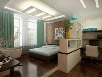 - You can use different finishes or different furniture to visually separate one area from another. For example, in the bedroom area, you can use more delicate pastel colors, light textiles, light furniture, and for the living room area choose leather upholstered furniture and a more contrasting finish. Such options always look good, but do not forget that you still furnish one room. Two zones should have common features and differences - usually the style is the same, and the color palette and texture can vary.