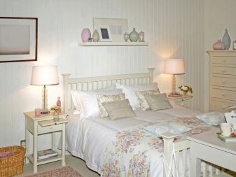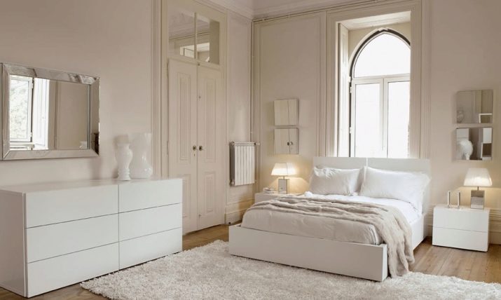 - Pure white can be used, but more often take close muted shades. - for example, it can be a creamy shade of white, white-gray or ivory. All of these options can be an excellent solution for both a small room and a spacious bedroom. The advantage of white is that it is very easy to combine with almost any other color: you can create a delicate romantic interior based on white with pink or peach tones, or, on the contrary, play with contrasts by combining white with chocolate and gray shades.
