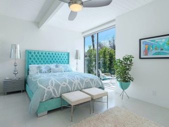 - A chic modern bedroom in turquoise colors with designer furniture looks great and will become a cozy place to relax. This space cannot be called boring, but the muted shade of turquoise does not irritate the eye and sets the basis for delicate powdery colors.