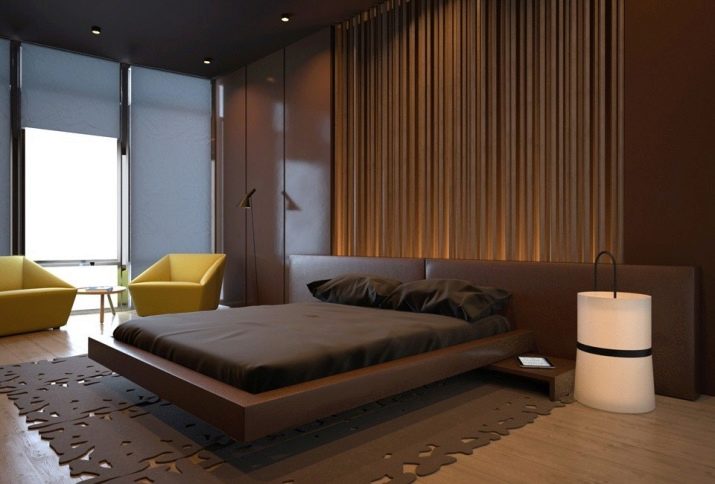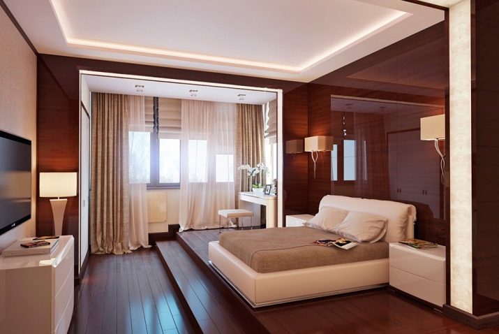 - The original version with a podium looks concise and stylish - this design is moderately conservative, but it is enlivened by modern elements - in particular, textiles and lighting. A beautiful bedroom with an emphasis on wood textures and shades will be comfortable and cozy.