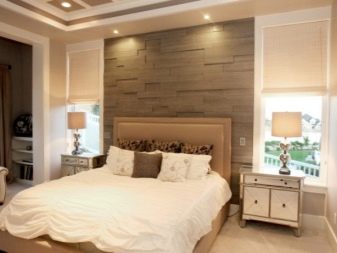 The coating in this case occupies the entire wall, and the panels are mounted horizontally. Opposite the decorated wall is a wooden cabinet of a similar shade, and laconic furniture is selected in a similar color. No decor is used in this case, but unusual bedside tables are mounted directly on the wall.