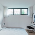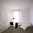 - Design of a bedroom with access to the balcony, the use of hanging drawers, spots and compartment doors.