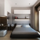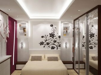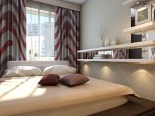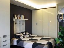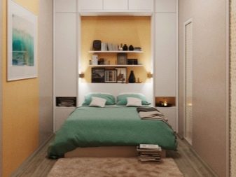 To rationally use the available floor space, one of the walls can be equipped with narrow built-in furniture. At the same time, in order to avoid the effect of presence in the warehouse, the colors of the furniture should be solid monochromatic, and the texture should be glossy. In the center of the wall, you can create a small niche with a width corresponding to the width of the bed. Wherein To maximize the use of the wall above the bed, you can build a shelf or a rack.