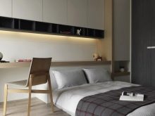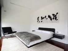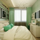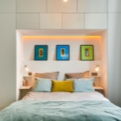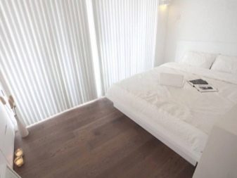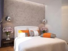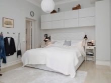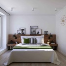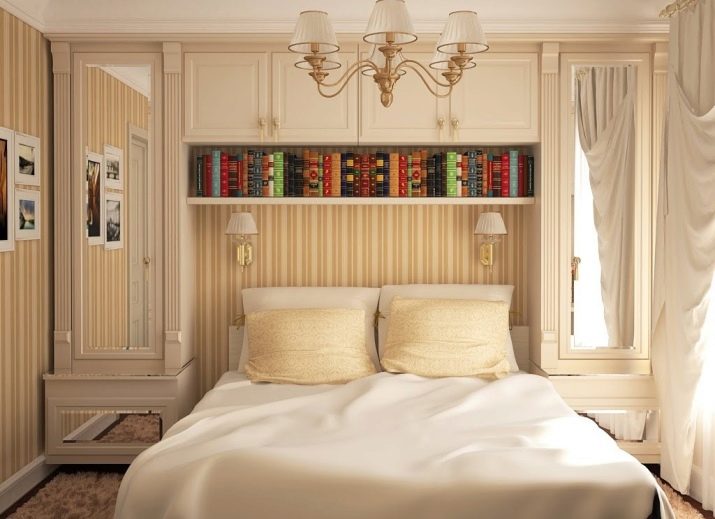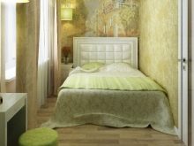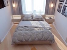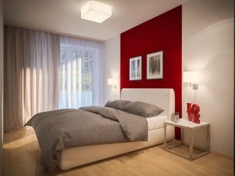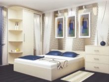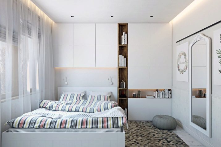 In another place, there is enough space for shelving on both sides of the bed, a chest of drawers for clothes. If you select a very compact furniture, you can also fit a dressing table with a small mirror into the bedroom. So that the furniture does not eat the space, its color should not be dark. Remembering the rule “The light does not outline the space”, it is selected in the same style.