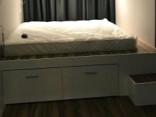 - A spectacular and unusual version of the arrangement of the bedroom with the creation of a podium bed, equipped with spacious drawers.