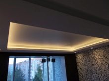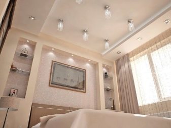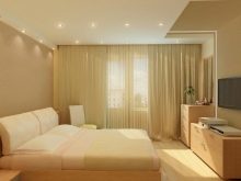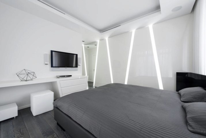 As for spotlights, they shine directionally, and so that the room is evenly lit, then they must be placed on the ceiling with equal pitch. If the customer does not want to use this type of lighting in the bedroom, you can give preference to the LED strip by mounting it on a molding or ceiling plinth.
