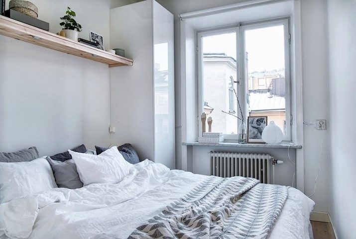 If the room is not only very small, but also narrow, no need to put a bed across the room. In this case, it will have to be set in such a way that it does not interfere with inspiration into the room. However, much depends on the location of the doorway and radiators. Say, with all desire, you can’t put a bed by the window if there is a battery under the windowsill.