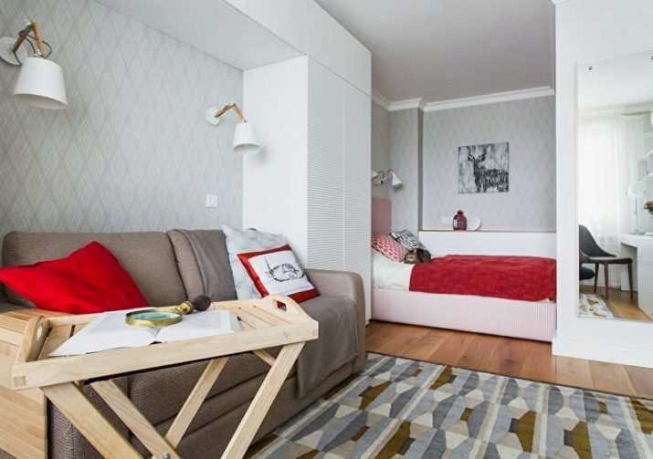 - An example of arranging a bedroom in a room combined with a living room, the use of identical lamps and a single color scheme.